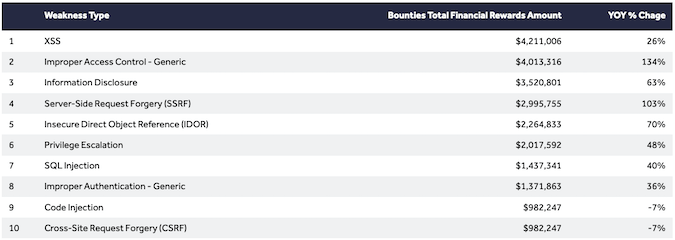 “These bugs account for 18% of all reported vulnerabilities, but the average bounty award is just US$501. That means organizations are mitigating this common, potentially painful bug on the cheap.”