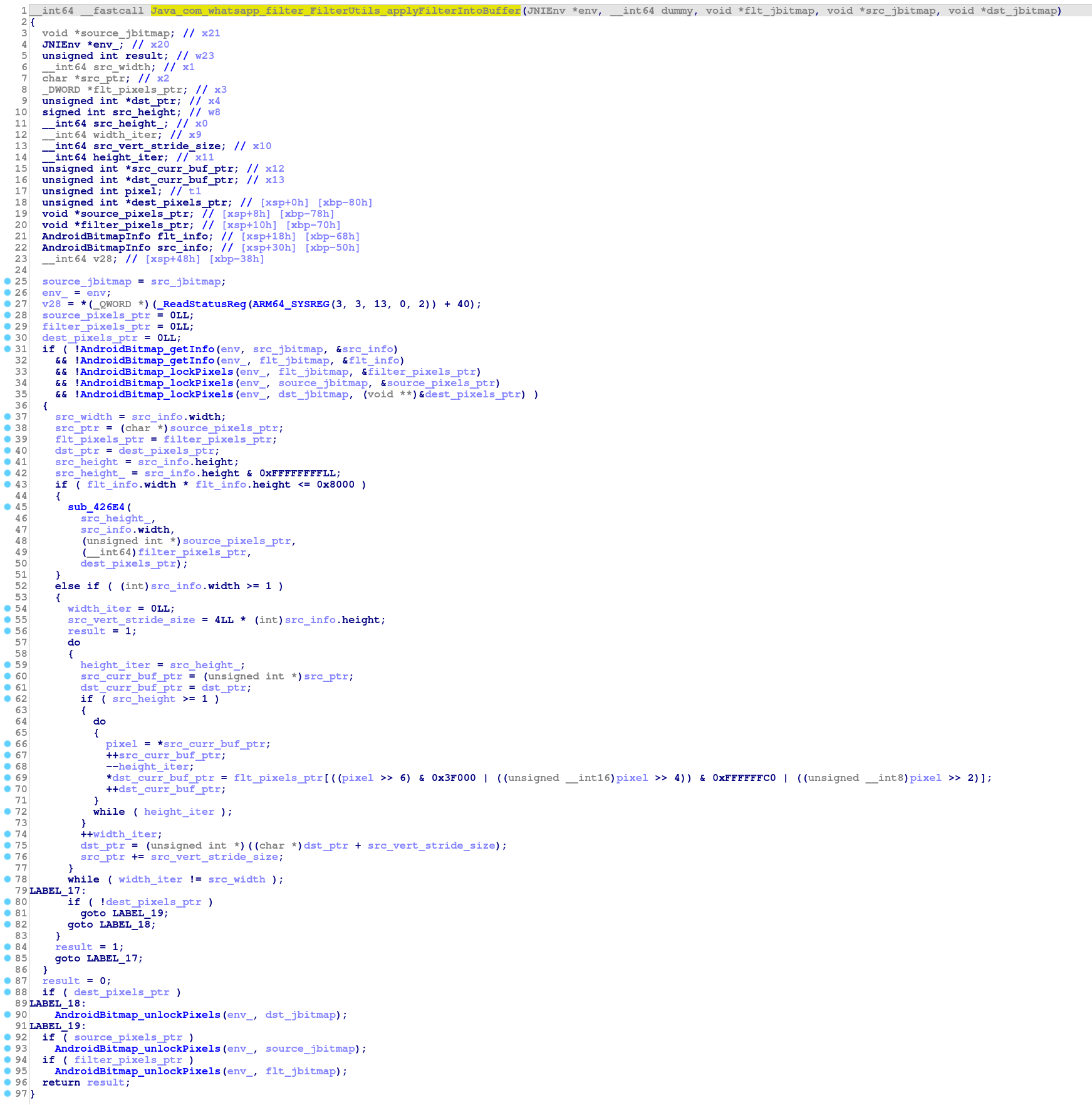 “We reverse-engineered the libwhatsapp.so library and used a debugger to analyze the root cause of the crash. We found that the vulnerability resides in a native function applyFilterIntoBuffer() in libwhatsapp.so library.” reads the analysis published by CheckPoint. “The problem is that both destination and source images are assumed to have the same dimensions and also the same format RGBA (meaning each pixel is stored as 4 bytes, hence the multiplication by 4).