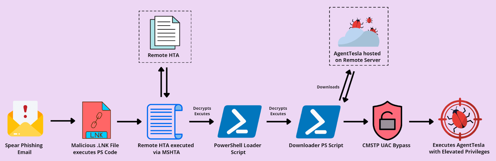 The HTA File then decrypts a PowerShell loader script which decrypts and loads another PowerShell script after performing AES Decryption and GZIP Decompression. The decrypted PowerShell script is the Downloader PS Script, which downloads and executes the Agent Tesla binary from a remote server. The malware is executed with administrative privileges by performing a UAC Bypass using the CMSTP.