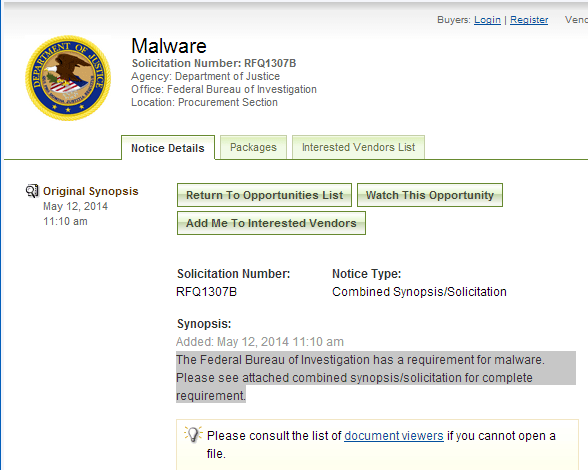 “The Federal Bureau of Investigation has a requirement for malware. Please see attached combined synopsis/solicitation for complete requirement.“