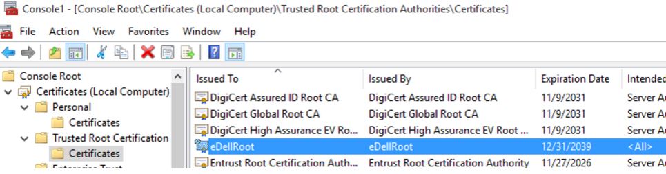 Unfortunately, the certificate cannot be simply removed due to a .DLL (–Dell.Foundation.Agent.Plugins.eDell.dll) included with the root certificate that reinstalls the file if it is deleted. Users have to delete both the .DLL and the certificate.