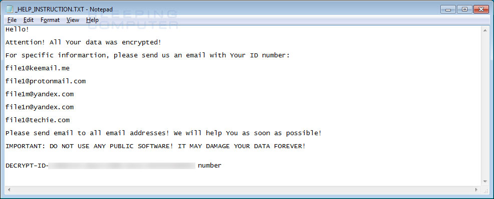 Experts discovered that this variant uses the same encryption methods of previous ones, the ransomware uses the same ransom note is still named _HELP_INSTRUCTION.TXT, but the contact emails to receive the payment instructions are [email protected], [email protected], [email protected], [email protected], and [email protected].