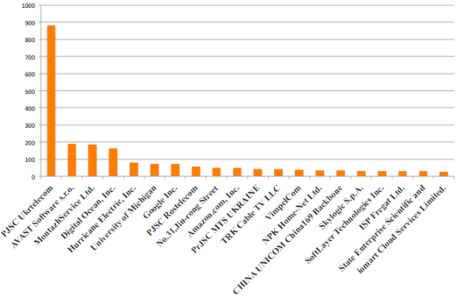 “Interestingly, most of the systems which beaconed to our sinkhole server were located in Ukraine with United States being the second most affected region. A graph showing the ISPs that were most heavily affected is below:”