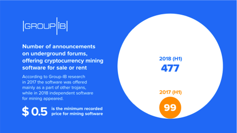 Group-IB, an international company specializing in the prevention of cyberattacks, is recording new outbreaks of illegal mining (cryptojacking) threats in the networks of commercial and state organizations. According to Group-IB’s Threat Intelligence, over a year, the number of shadow-forum ads offering mining software has increased fivefold (H1 2018 vs H1 2017). Group-IB experts say it is a very dangerous tendency to have so many mining Trojans available designed to use other people’s devices and infrastructure for illegitimate generation of cryptocurrency.