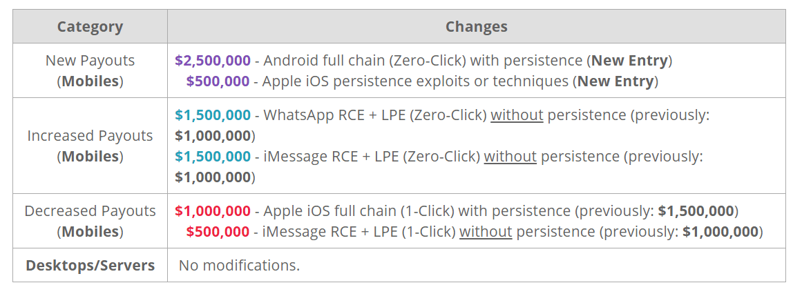 A zero-click exploit chain for Android would be rewarded with up to $2.5 million, while an exploit chain for iOS only $2 million.