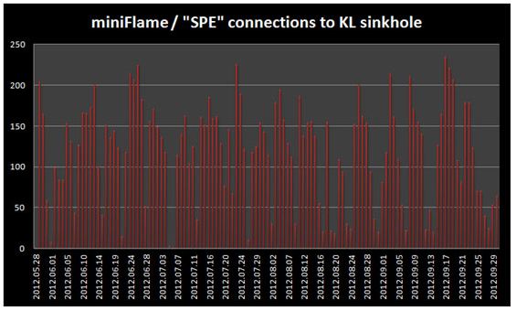 Looking Sinkhole statistics of miniFlame it is possible to note that between 28th of May 2012 and September 30th, the servers counted around 14,000 connections in total from about 90 different IPs.